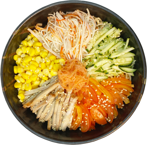 A cold ramen dish with slices of pork belly, fresh tomatoes, cucumber, kani, and corn, and a tangy ponzu sauce. Refreshing and delicious!